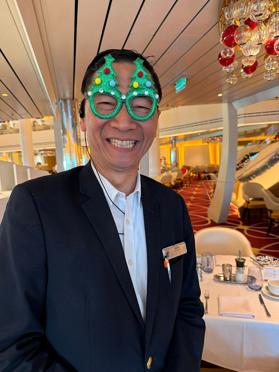 Holiday décor, clinking glasses, and guests dressed in red and green filled the space. Our waiters, Dony and his assistant Adikerta, turned service into art, presenting a new napkin creation each evening—swans and intricate origami wonders.