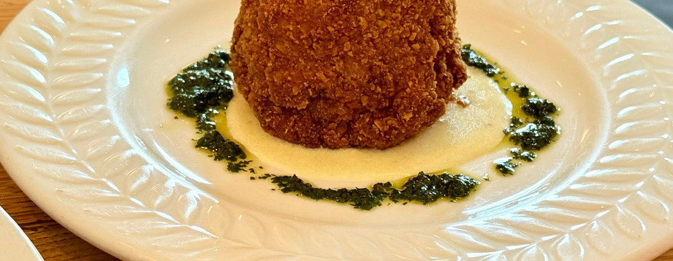 We began with Seared Scallops over chorizo potato salad, brightened with chimichurri and aioli, and a Crab Cake drizzled in a bold monk mustard cream sauce. Another standout dish was the roasted Cauliflower with cherry brown butter vinaigrette, almond, and local chard—surprisingly complex and deeply comforting. Our salads—an arugula mix with grilled South Carolina peaches and roasted corn, and a juicy Heirloom Tomato Salad—tasted like peak summer.